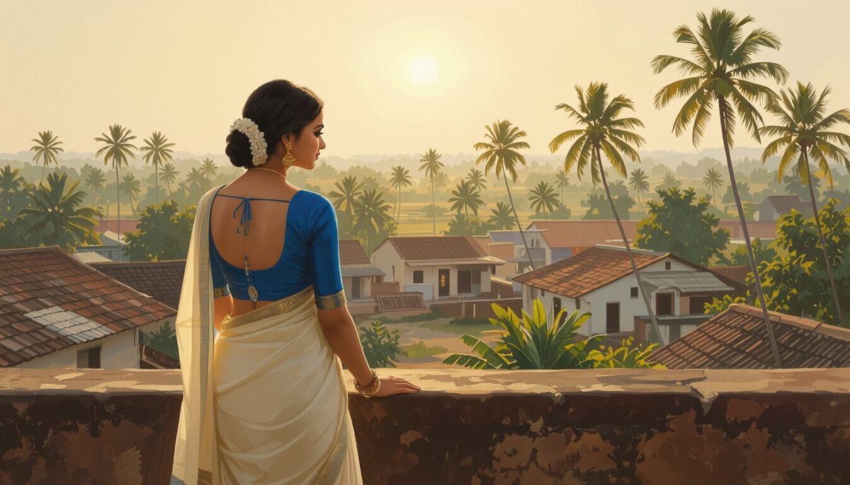 This image shows an Indian woman in a traditional saree standing on a rooftop, gazing over a peaceful village. The scene is reminiscent of classic Indian paintings.