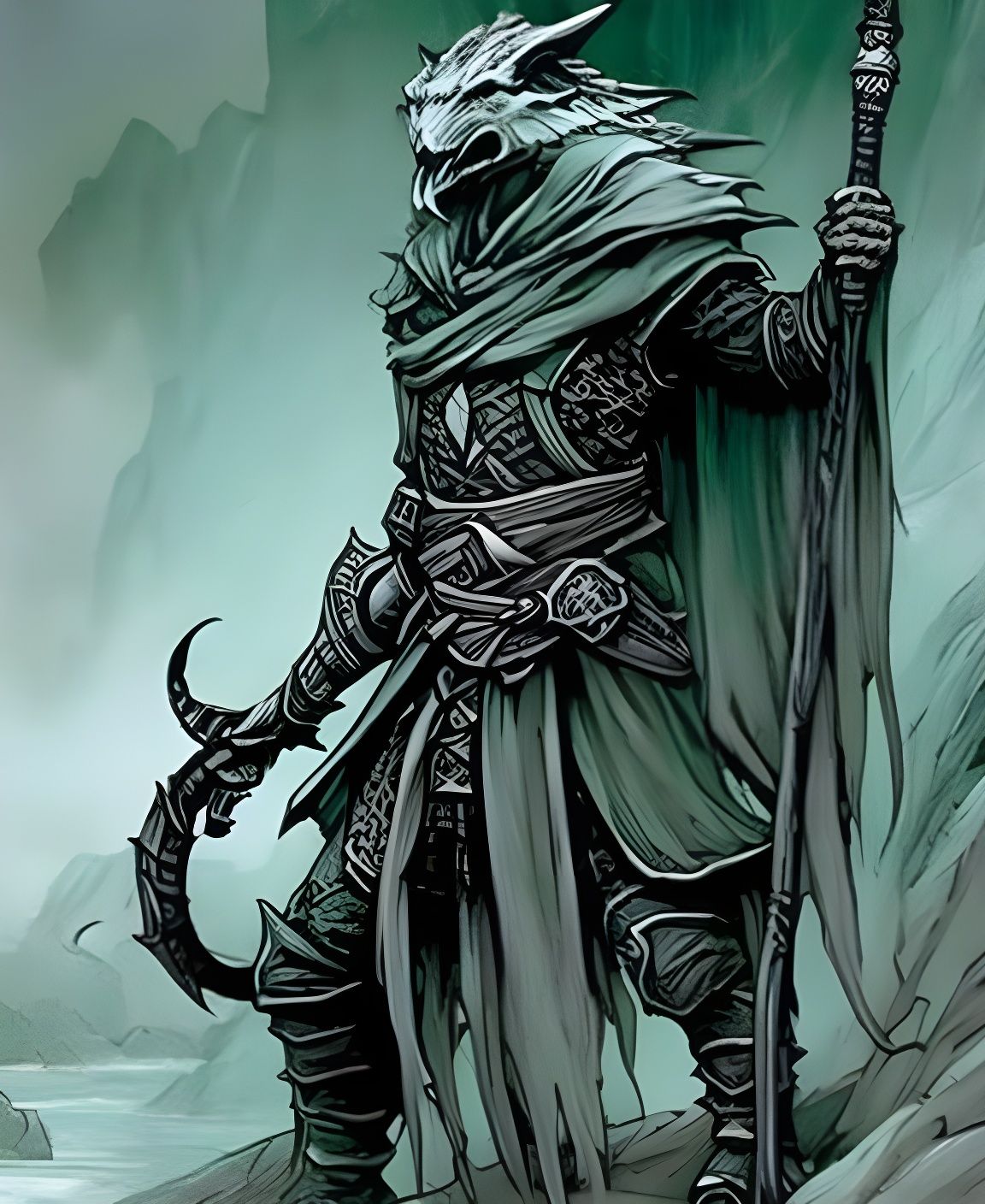 A pen and ink drawing of a dragonborn fishing in a cenote. The fantasy art features a full-length portrait of a humanoid with dragon-like features in jungle green and aqua ink.