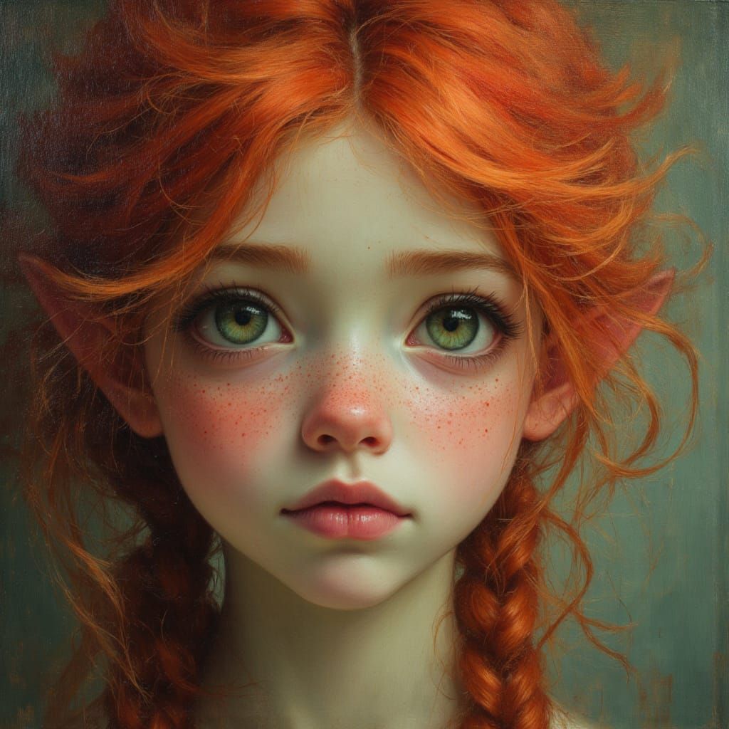 This image features a close-up, 3/4 profile of a lively, ethereal fae with wild red hair, large green eyes, and freckles, rendered in a brushed oil painting style.