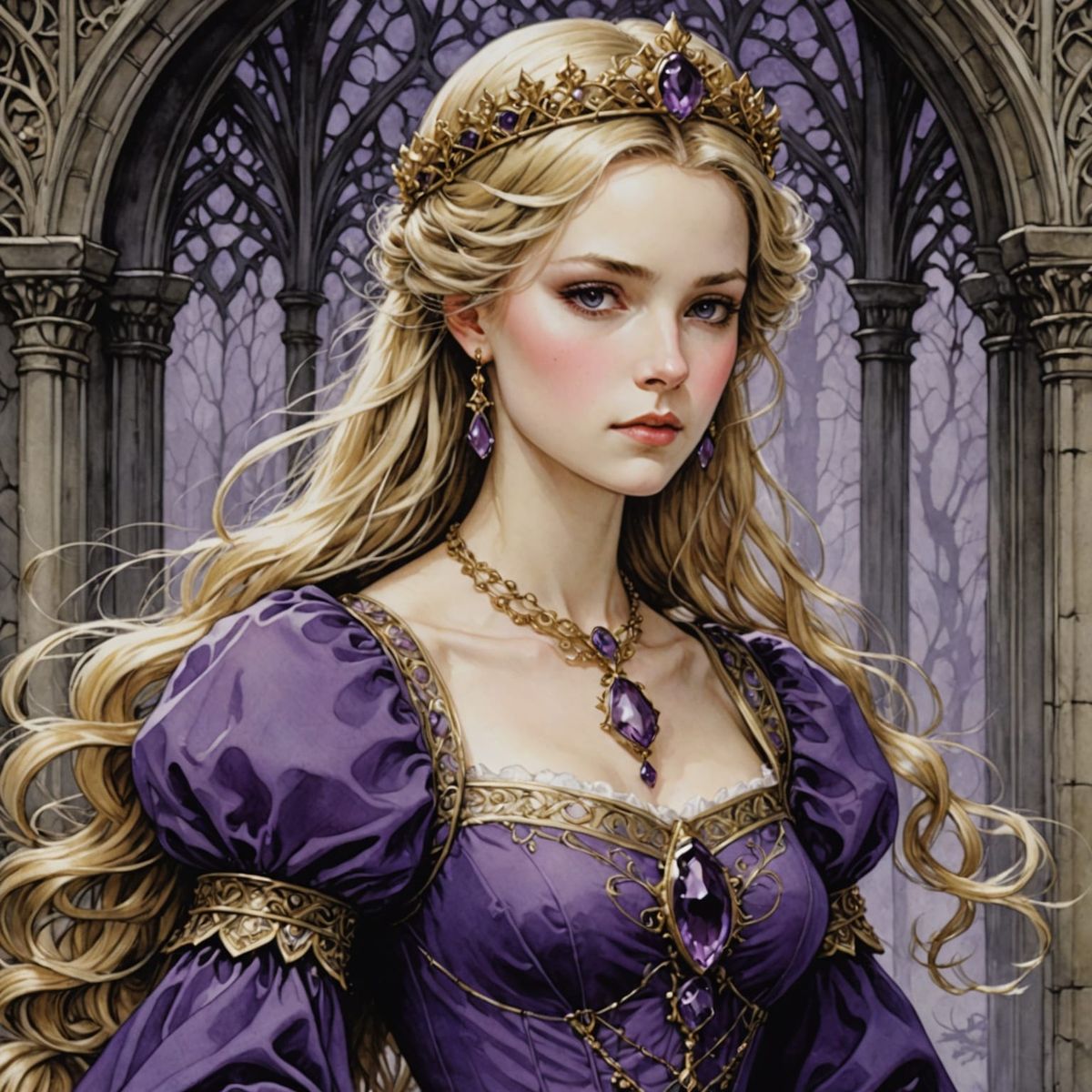 This image shows a regal, blond-haired maiden with violet eyes, wearing a lavish purple gown and a gold crown, adorned with an amethyst necklace, rendered in a detailed, elegant style reminiscent of Arthur Rackham's artwork.