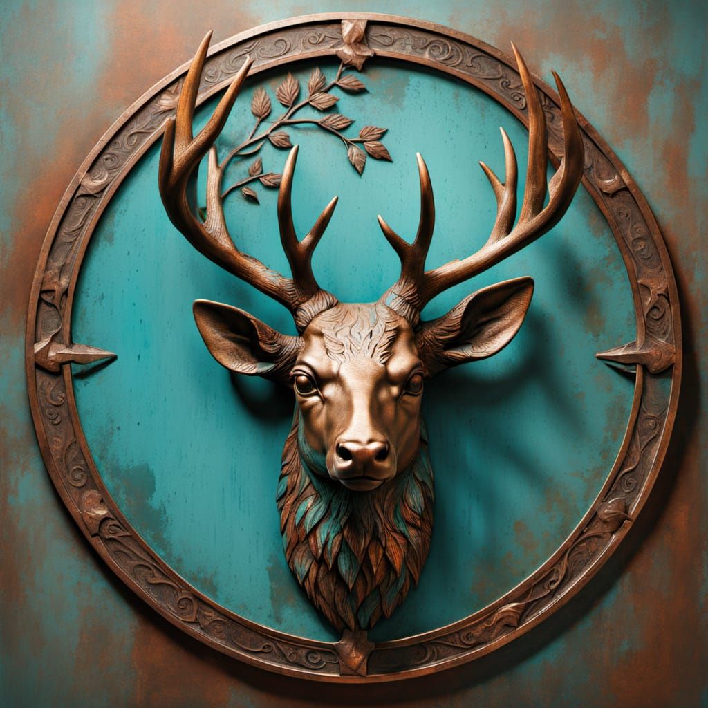 This image features a detailed circular embossed sculpture of a bronze white-tailed deer head. Text reads 'New Hampshire Wildlife' above and below. The weathered bronze and copper artwork has a 3D effect on a turquoise, rust-patched background.