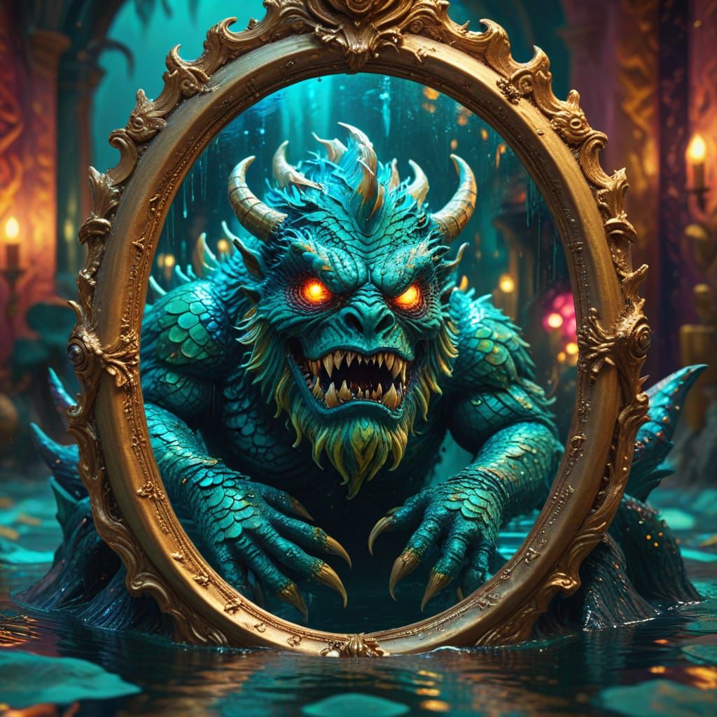 This image shows a close-up of a monster reflected in rose-tinted water. The digital painting features iridescent teal scales, dramatic golden lighting, and vibrant colors in a fauvist expressionist style.