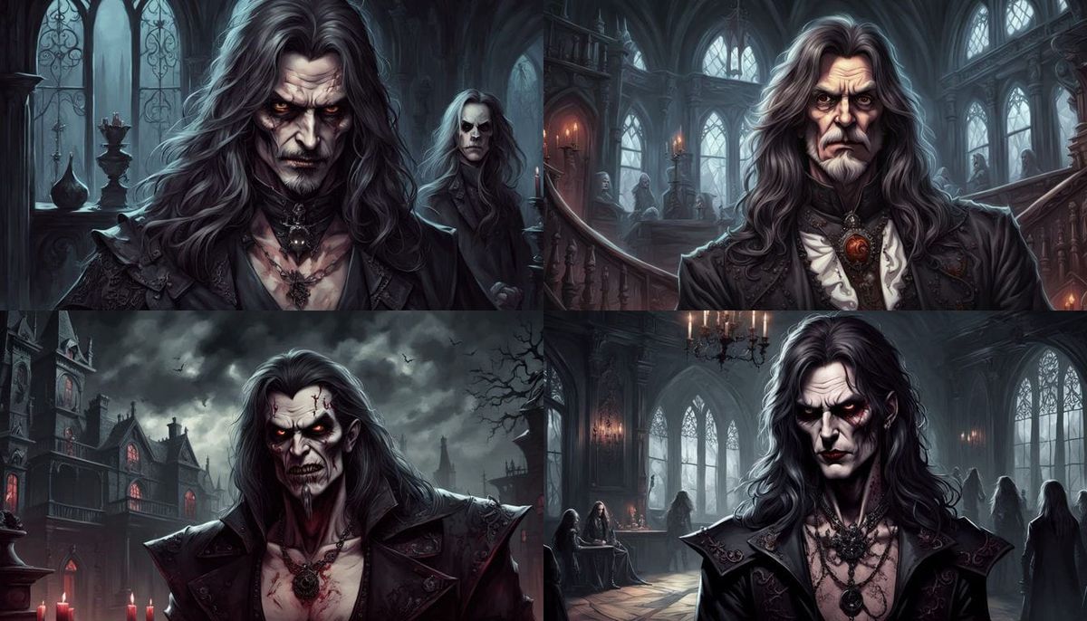 This painting depicts a long-haired, 56-year-old heavy metal rocker surrounded by timid cartoon people and vampires within a Victorian house setting.