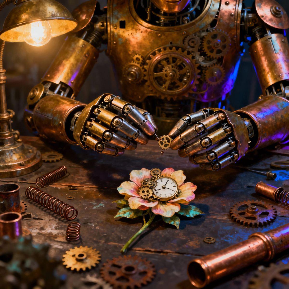 A whimsical steampunk automaton meticulously assembling a delicate clockwork flower. Gears and springs are scattered across a cluttered workbench, bathed in the warm glow of gaslight. The automaton's metallic fingers are poised with extreme precision. The scene is rendered in a hyperrealistic digital ...