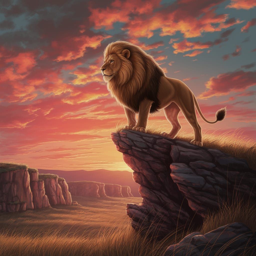 A striking picture of a golden-maned lion standing on a rocky cliff at sunset. Warm light bathes the savanna below. This photorealistic image captures intricate textures, inspired by dramatic landscape painting.