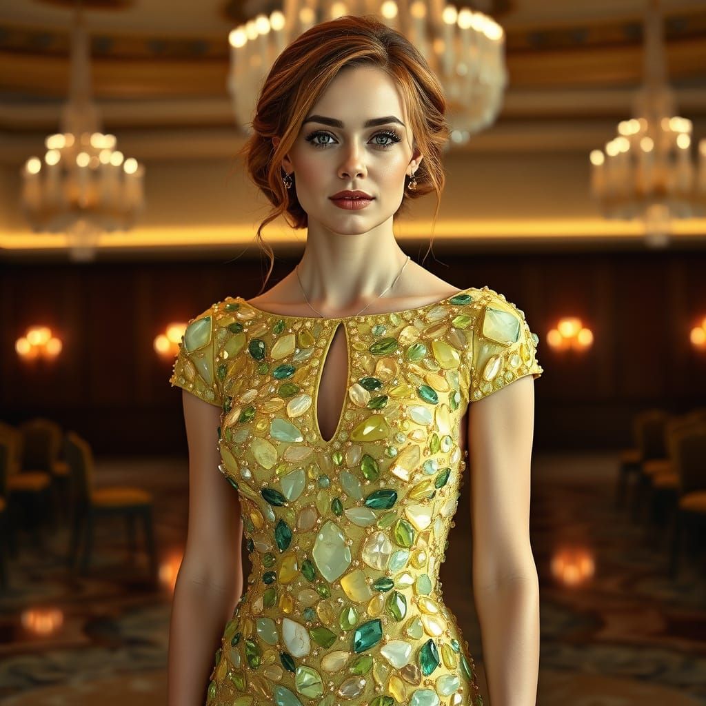 This image features a woman in a stunning mermaid dress with gradating chartreuse, beige, and grassgreen hues, paired with matching jewelry, set against a grand ballroom backdrop. The hyperrealistic style captures a moment frozen in time with sharp focus and moody lighting.