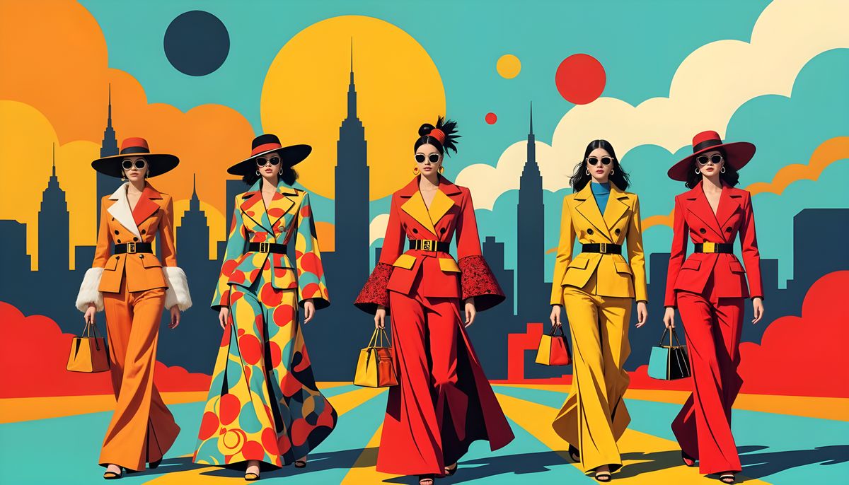 This image captures a vibrant 1970s fashion show. Models showcase bold, avant-garde clothing blending future and past styles against a graphic, abstract city backdrop.