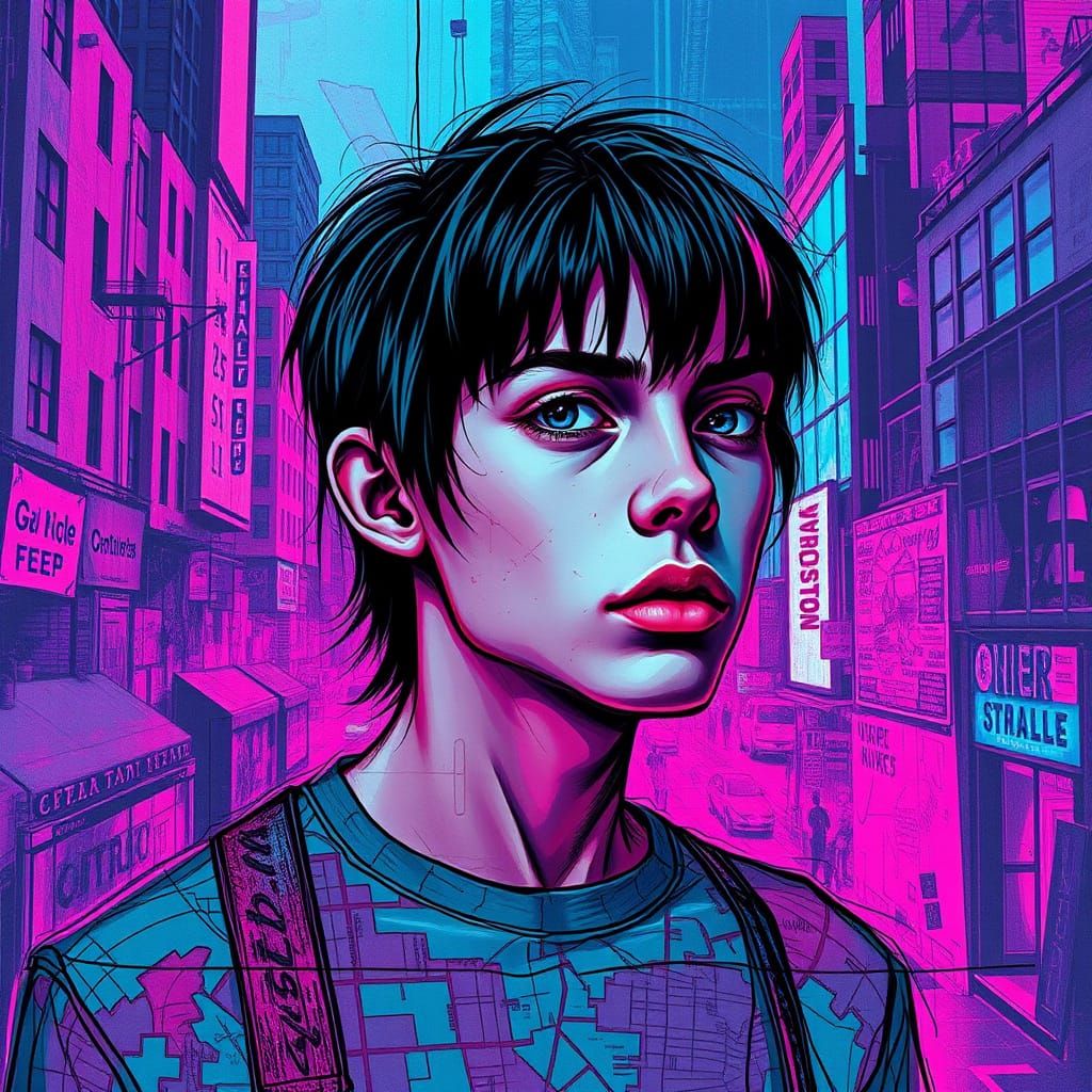 This image shows a vibrant, conceptual portrait of a single youth figure immersed in a neon-drenched cityscape. The artwork combines elements of raw, expressive figures with a cyberpunk aesthetic, featuring bold colors and distorted linework.
