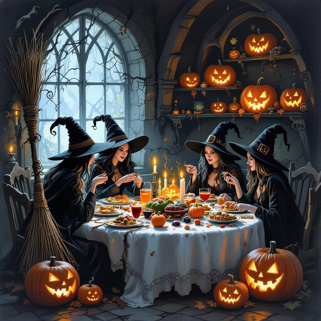 This image depicts a magical Halloween feast with witches around a table of spooky treats, a broom, and glowing pumpkins. Rendered in a dark fantasy style with atmospheric lighting.