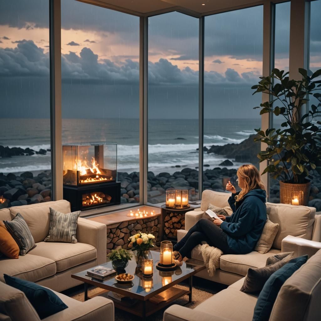 A cozy coastal interior scene at night featuring a warm, inviting space with a fireplace and plush furnishings. A rainy scene is visible through a large glass wall, contrasting the interior's golden glow.