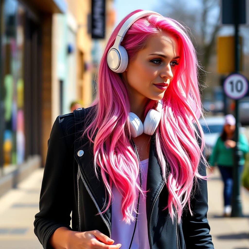 This image shows a woman with long pink hair listening to music on a sunny street. She is wearing headphones and the scene is vibrant with color.