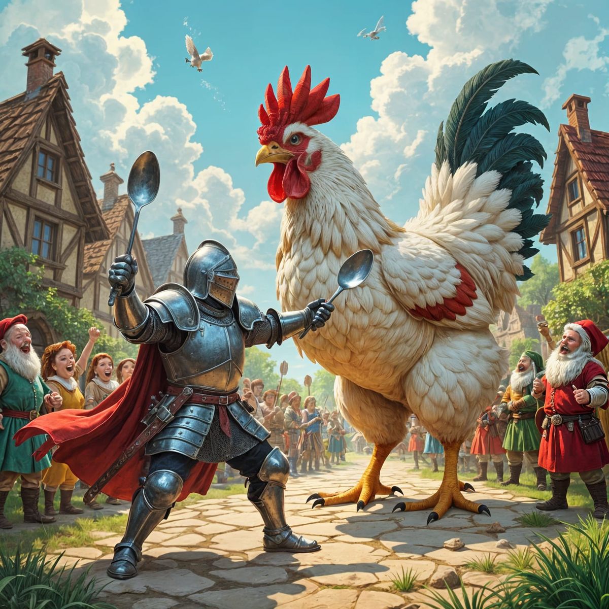 This image shows a medieval knight comically battling an enormous chicken with a spoon as villagers look on. The scene is rendered in a colorful and detailed cartoon fantasy style.