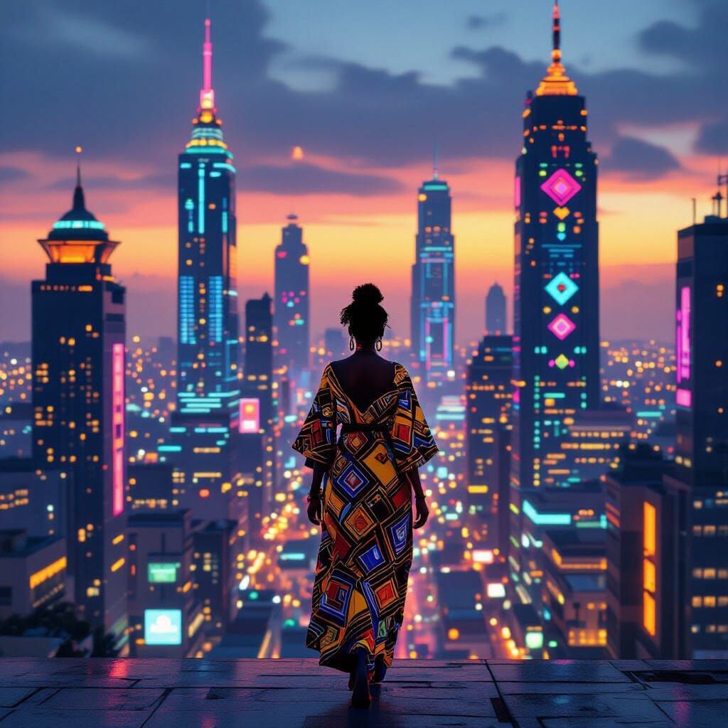 A stunning image of a futuristic African city at dusk, showcasing vibrant neon lights and traditional Yoruba patterns. A woman in dashiki attire walks among the cyberpunk-style skyscrapers, all rendered with cinematic lighting.