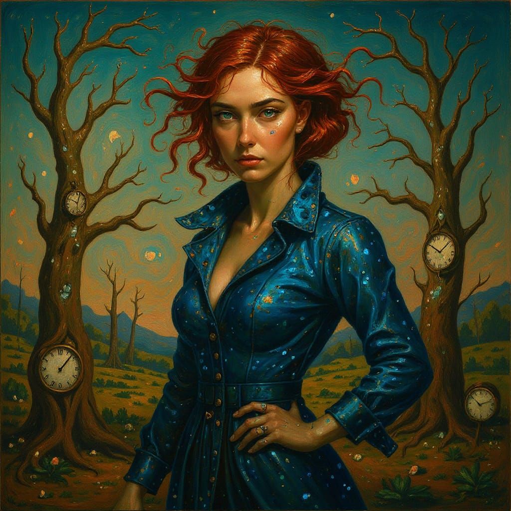 A vintage photograph of a beautiful red-haired woman in a surreal garden. The scene features twisted trees and melting clocks in a dada, expressionist style with deep colors and fine detail.