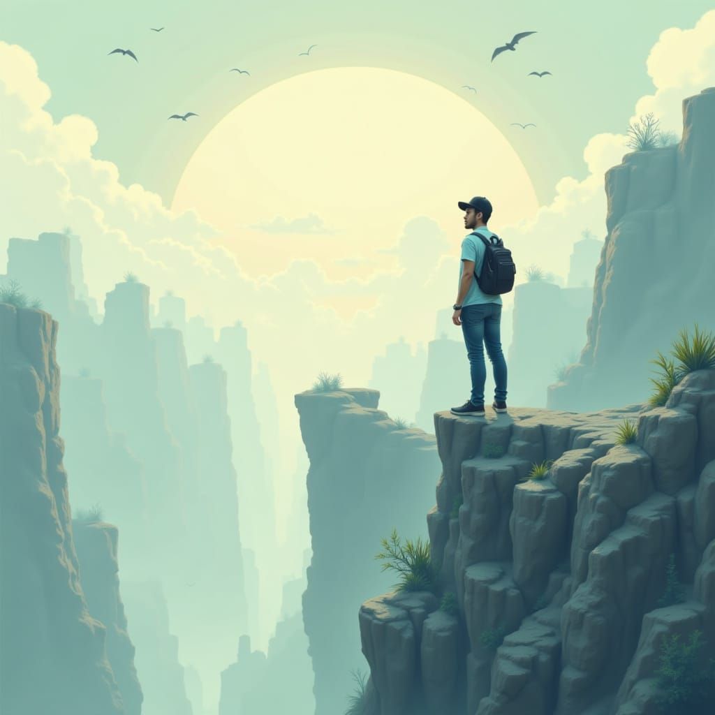 This image depicts a person standing at a cliff's edge, surrounded by a serene sunrise in soft teal, gray, and white hues, blending modern and clean typography in a minimalist aesthetic.