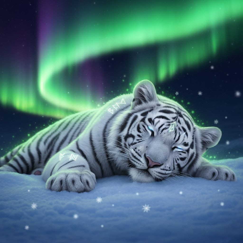 This image shows a white tiger cub sleeping under vibrant aurora borealis. Celtic energy and glowing runes add a magical, ethereal touch to the peaceful winter scene.
