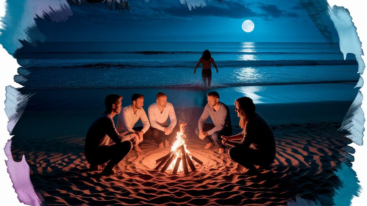 This image shows a group of people around a beach campfire at night, rendered in an alcohol ink style. Aquaman is walking out of the ocean toward the shore.