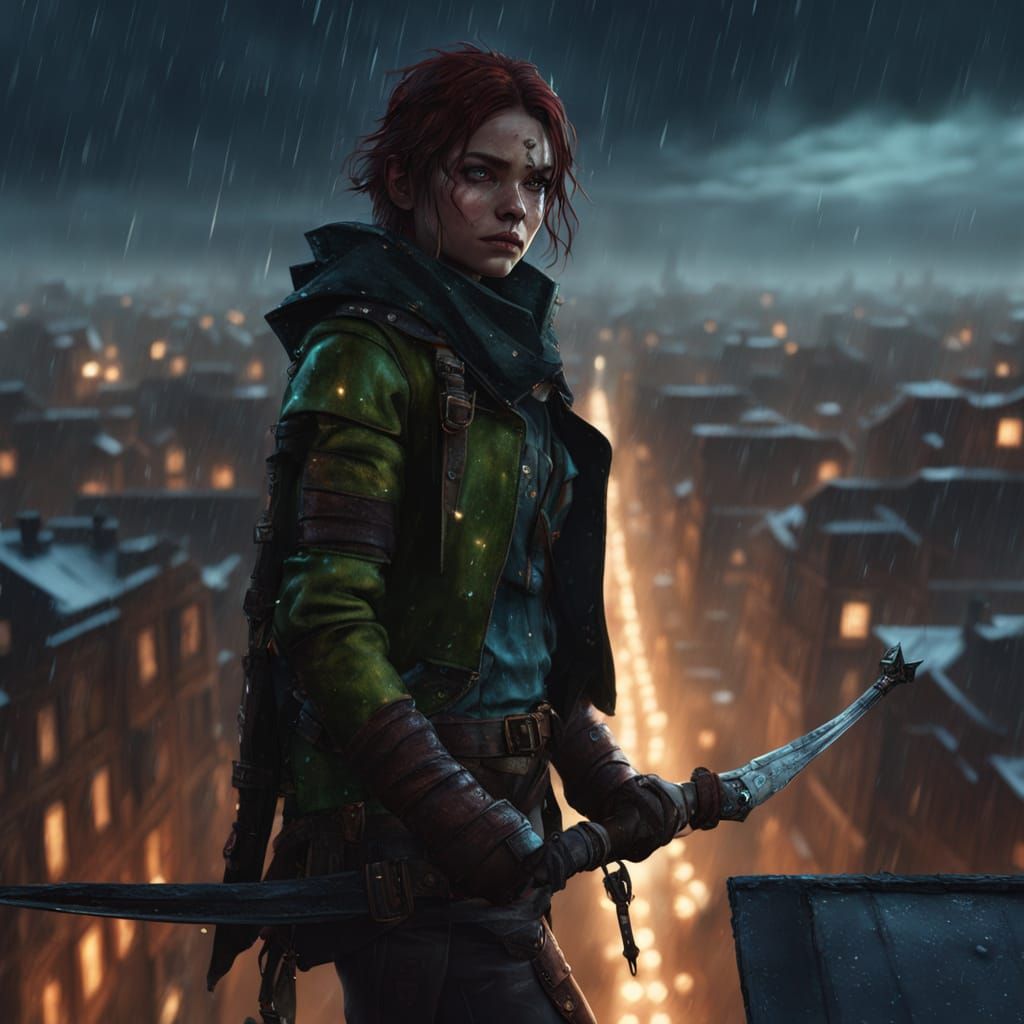 This dramatic image captures a halfling rogue on a city rooftop, illuminated by warm golden light from a nearby window, contrasting with the cool blue tones of the rainy night. Rich colors, high contrast, and detailed textures bring the scene to life.