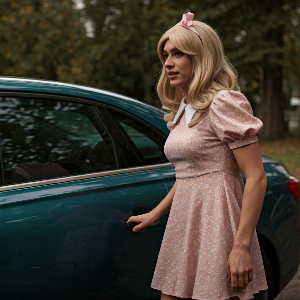 Cinematic film still of a crossdressing young man with blonde hair and feminine features opening a car door. Shot with film grain and dramatic lighting for an atmospheric, epic feel.