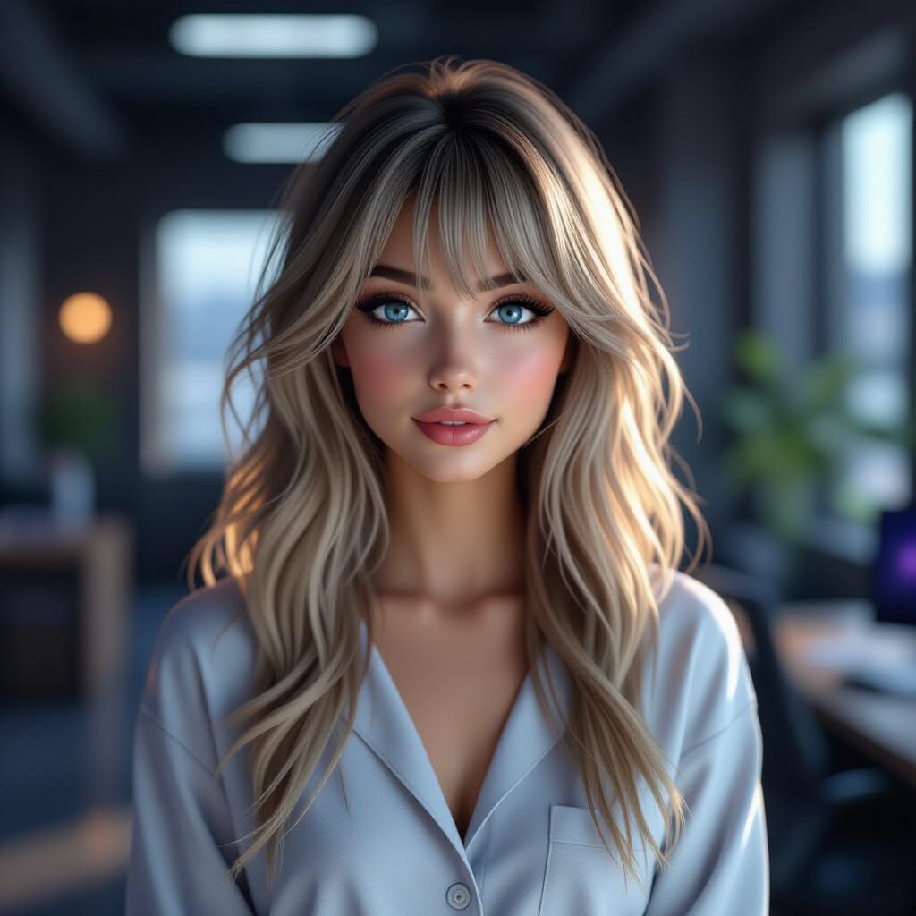 A young woman in rumpled pajamas arrives at a busy office, with messy blonde hair and striking blue eyes. Backlit for a dramatic effect, the image features deep space elements.
