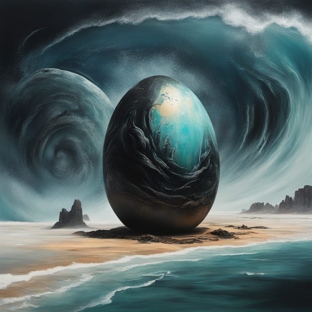 This image is an abstract, surrealist painting depicting a bison with elements of a scandalous surf crest and egg, rendered in a cyberpunk style with dusty lighting.