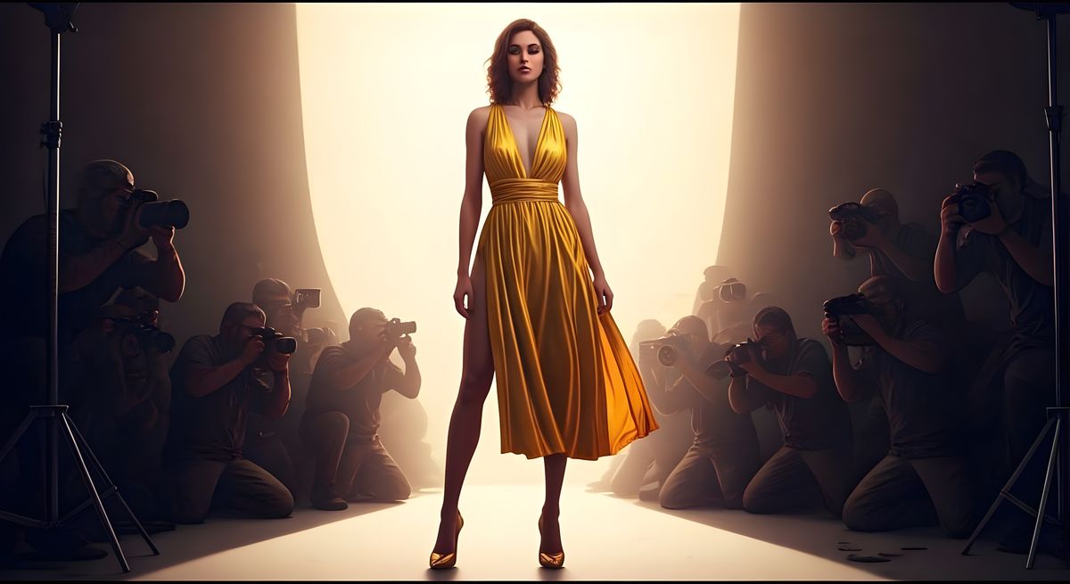 This image showcases a stunning model posing confidently in a daylight studio, surrounded by photographers, with intricate details and a masterful use of color and light, reminiscent of Art Nouveau and hyper-realistic styles.