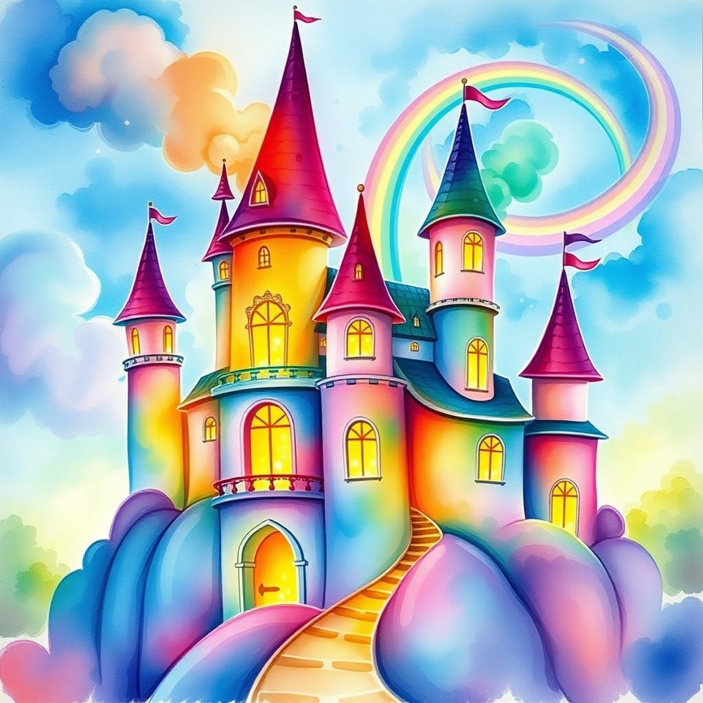 This image shows a fantastical castle in a whimsical watercolor style. It features swirling, luminous colors, soft brushstrokes, glowing windows, and a rainbow arching across the sky.