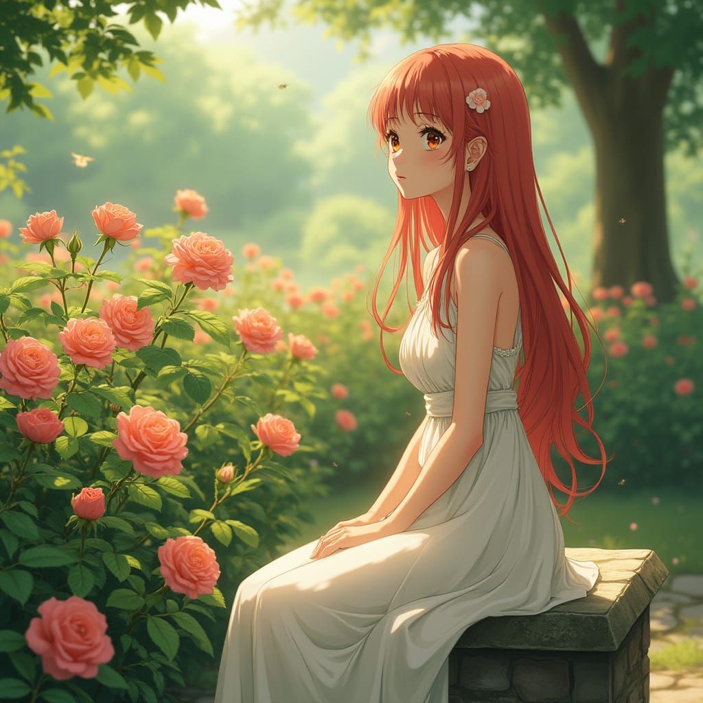A tranquil scene of a young woman in a sunlit garden. She sits on a bench near roses, her expression thoughtful, rendered with soft shadows and shallow focus in an anime style.