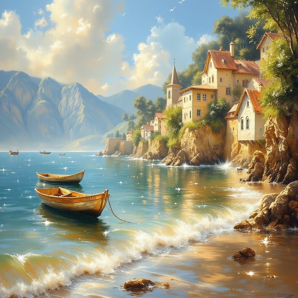 This image shows a beautiful historical coastal village at sunrise, painted in a luminous Impressionistic style with vibrant colors focusing on light and atmosphere.