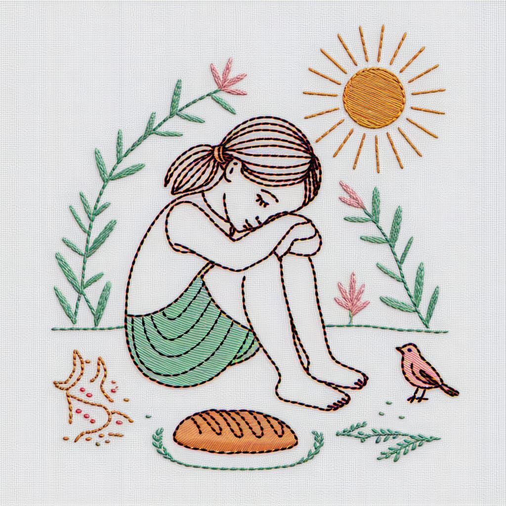 A delicate embroidery of a girl seated with a rabbit and bird nearby. The artwork features soft, muted colors and a realistic stitch texture to enhance the tender scene.