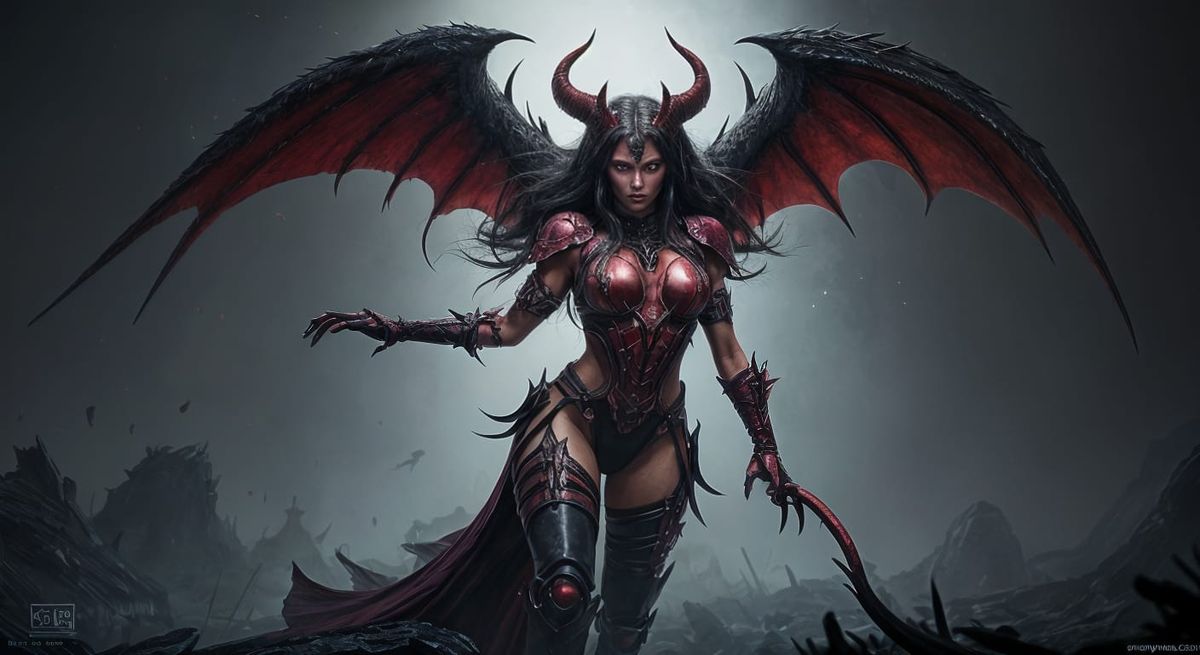 This image depicts a striking female demon with red leather armor, adorned with intricate details and dark fantasy elements. Her black wings and owl-like legs add to her ominous presence, set against a backdrop of deep, rich colors