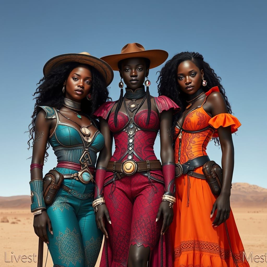 A striking picture of three Black women in elaborate Western clothing, posed like characters from Westworld. The image blends futuristic AI elements with vibrant colors and a dystopian atmosphere.