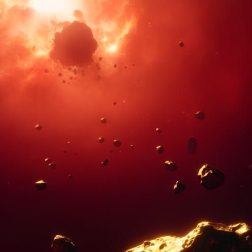 A dramatic image of a red sun in deep space, enveloped by glowing ionized gas and shimmering gold asteroids. Burning meteorites fill the background in this digital artwork.