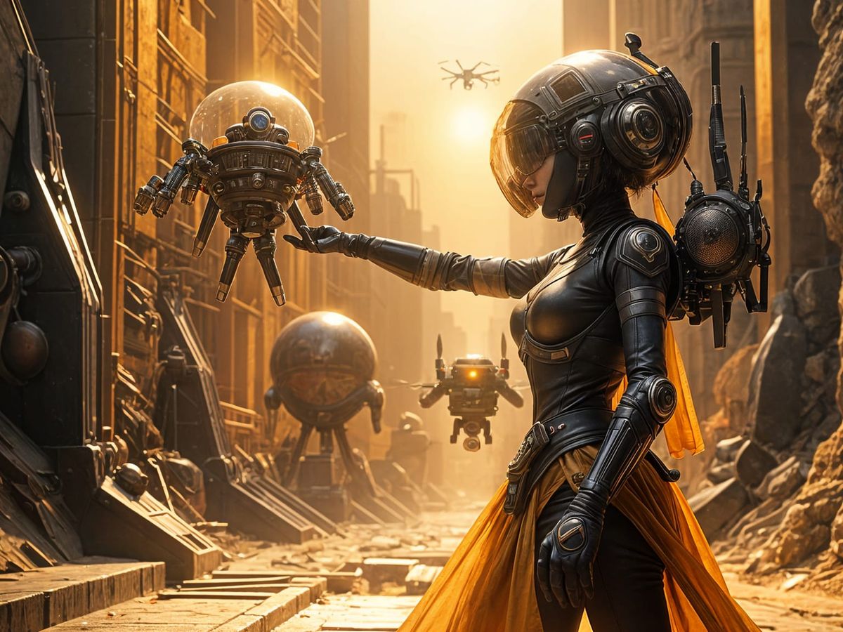 This image shows a woman in high-tech gloves making a falconer-like gesture to receive a landing drone. The scene is bathed in the warm light of golden hour.