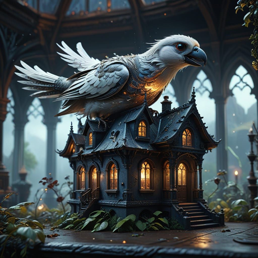 This image is a detailed, fantastical digital painting of a ghostly bird amidst a mysterious, vintage atmosphere. The artwork features intricate details, deep colors, and a sense of wonder, as if captured on a DSLR camera with a sharp focus and bokeh effect.