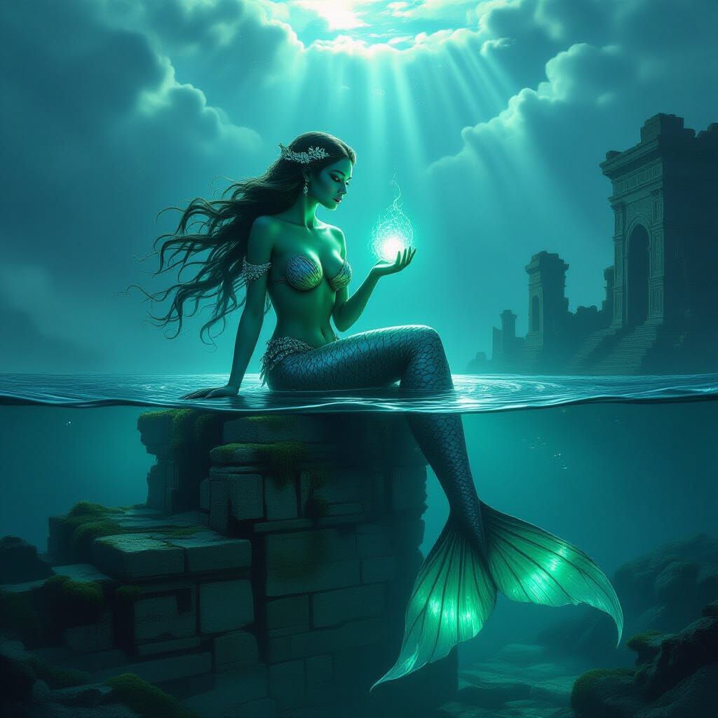A mermaid with glowing scales rests on ancient ruins in a stormy sea. This digital matte painting features surreal dark fantasy elements with dramatic lighting.