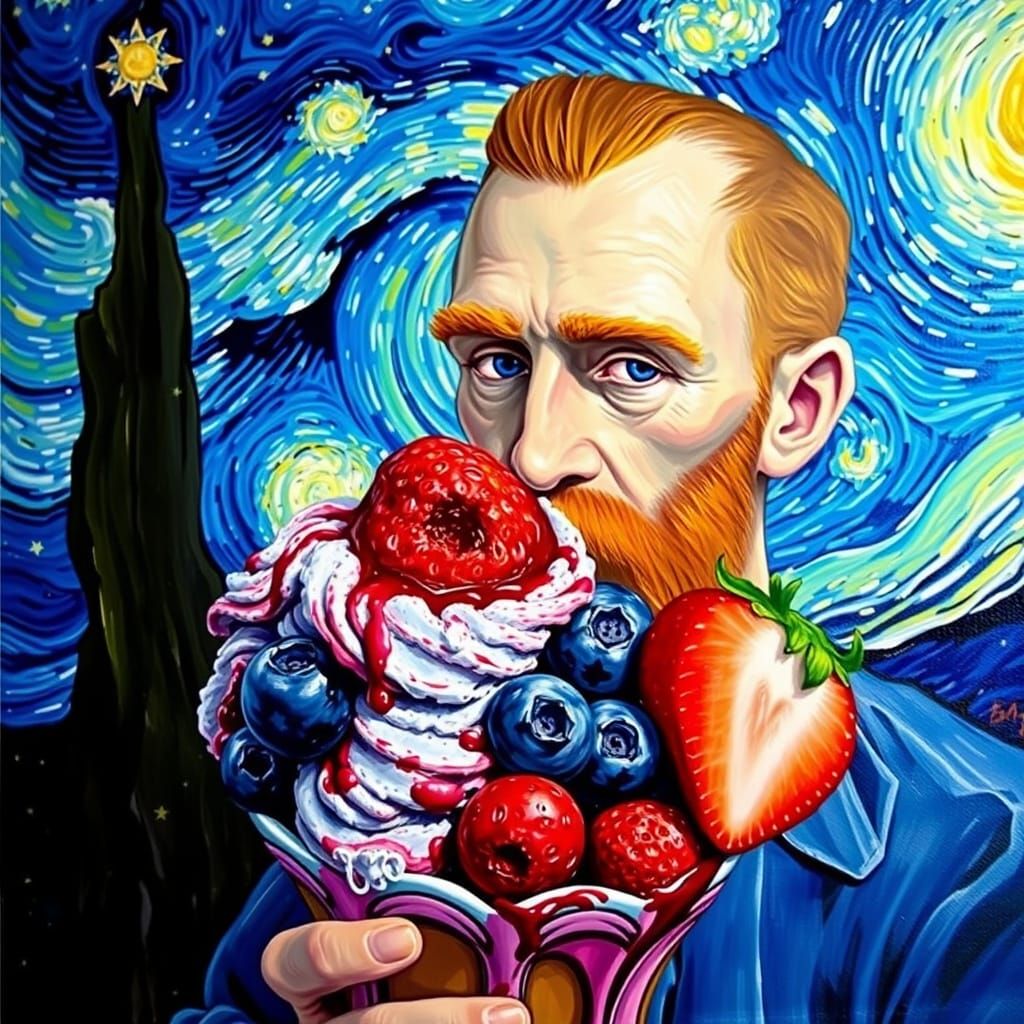 A vibrant oil painting of Van Gogh enjoying blueberry and strawberry ice cream. The artwork captures the swirling brushstrokes and vivid colors reminiscent of Impressionism.