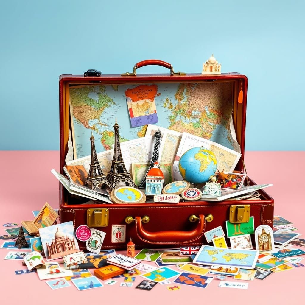 This whimsical image showcases a vintage leather suitcase bursting with colorful maps, globes, and travel brochures, featuring miniature landmarks from around the world, amidst a riot of ticket stubs, postcards, and travel stickers, blending the styles of Wes Anderson, Camille Rose Garcia, and Mark Ryden...