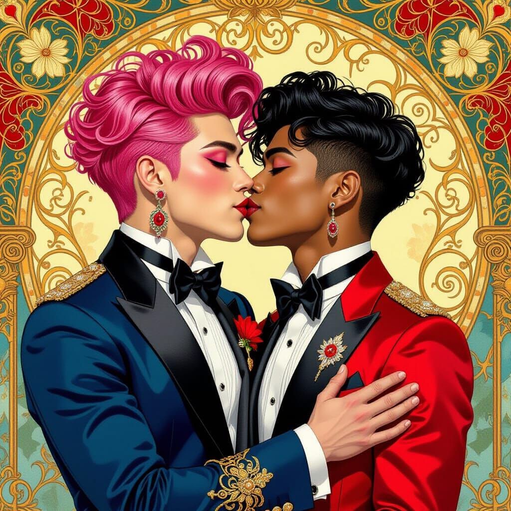 This image shows two teenage men in tuxedos embracing and kissing. The men have matching hairstyles and earrings. An Art Nouveau aesthetic is evident, with hyperrealistic, intricate details and vibrant colours.