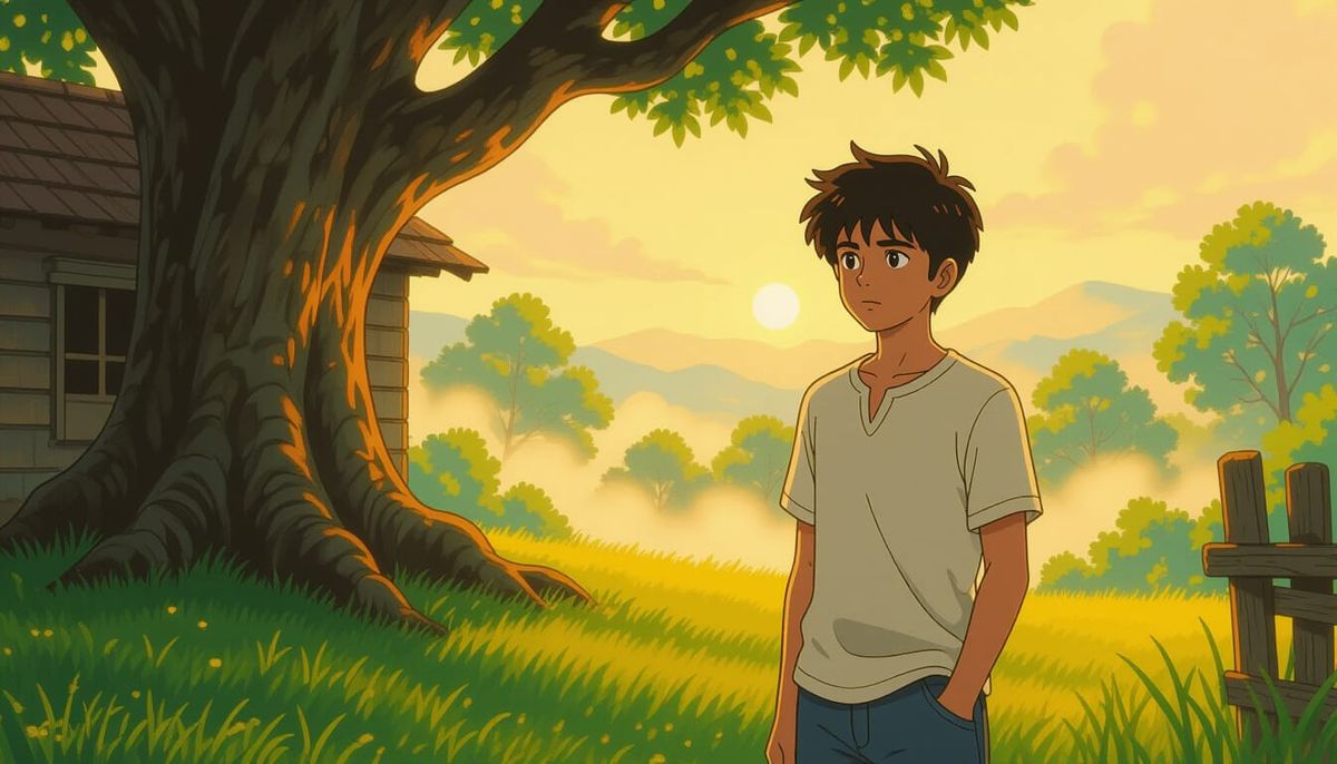 A portrait of a young Indian man bathed in sunrise light, with mist around banyan trees. Features whimsical charm and ethereal lighting, inspired by Studio Ghibli and Makoto Shinkai.