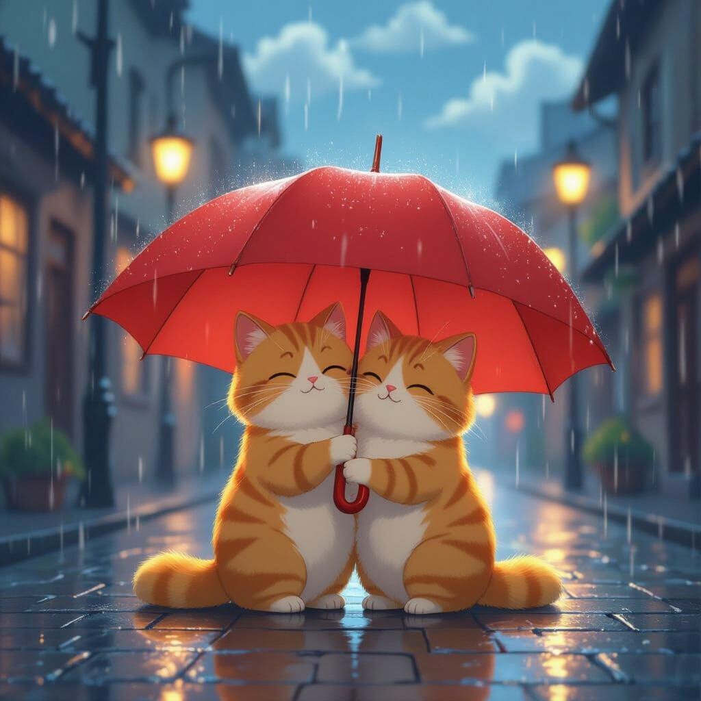 This charming anime-style image shows two ginger cats sharing a red umbrella on a wet cobblestone street, with city light reflections. A magical, sunlit atmosphere enhances the scene.