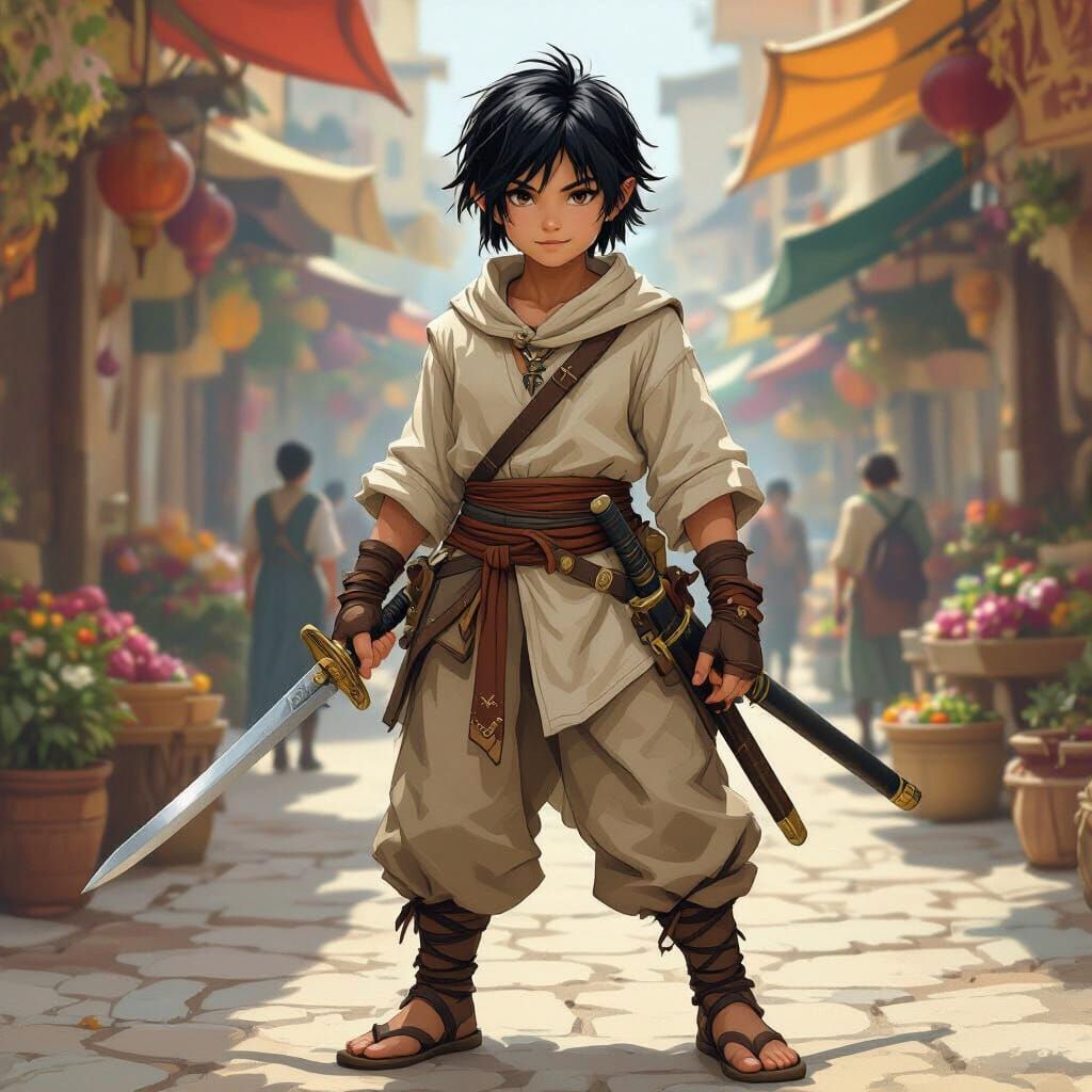 This image shows a halfling monk merchant with short black hair in a vibrant marketplace. He is wearing loose, comfortable clothing and wielding a short sword, rendered with fantastical details.