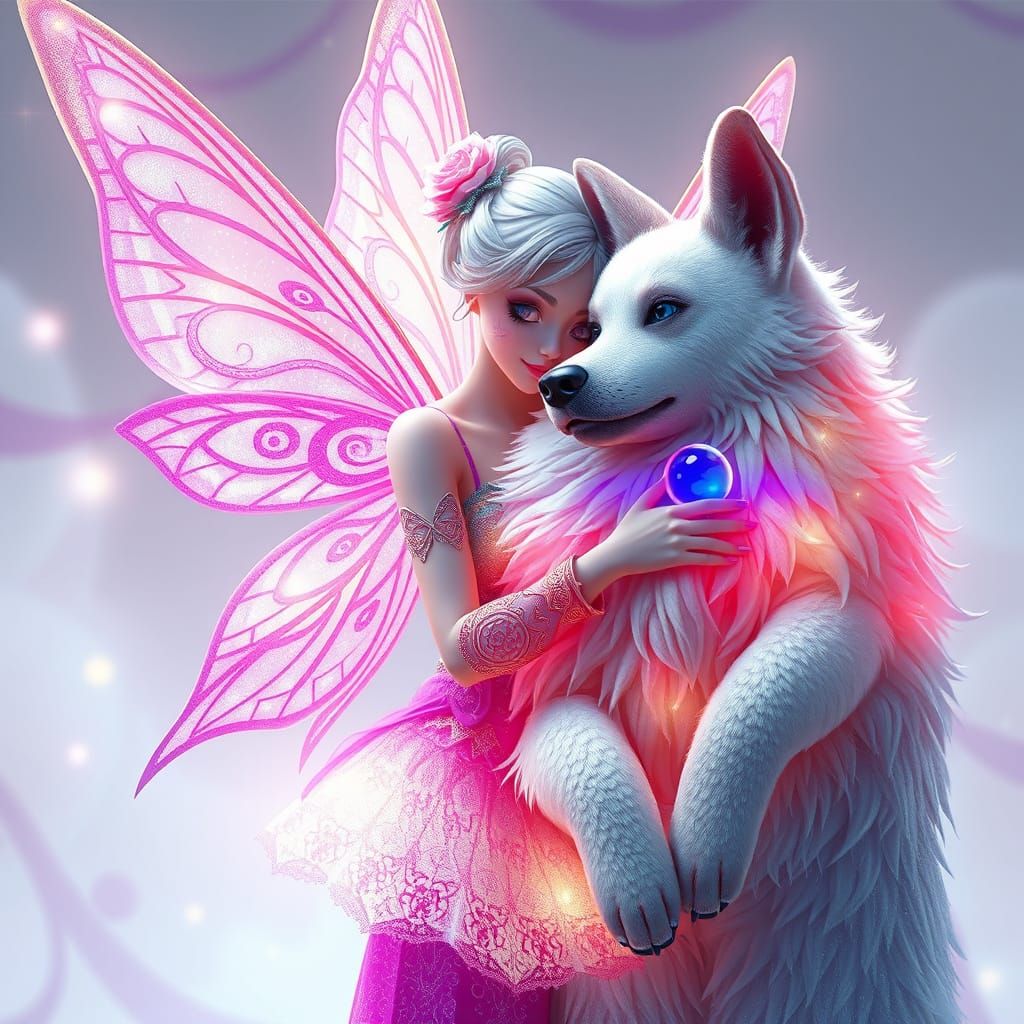 This image shows a luminous fairy with delicate wings embracing a majestic dog, set against a soft, dreamy background. The artwork blends modern digital art with traditional fantasy illustration, featuring intricate patterns and ultrafine details.