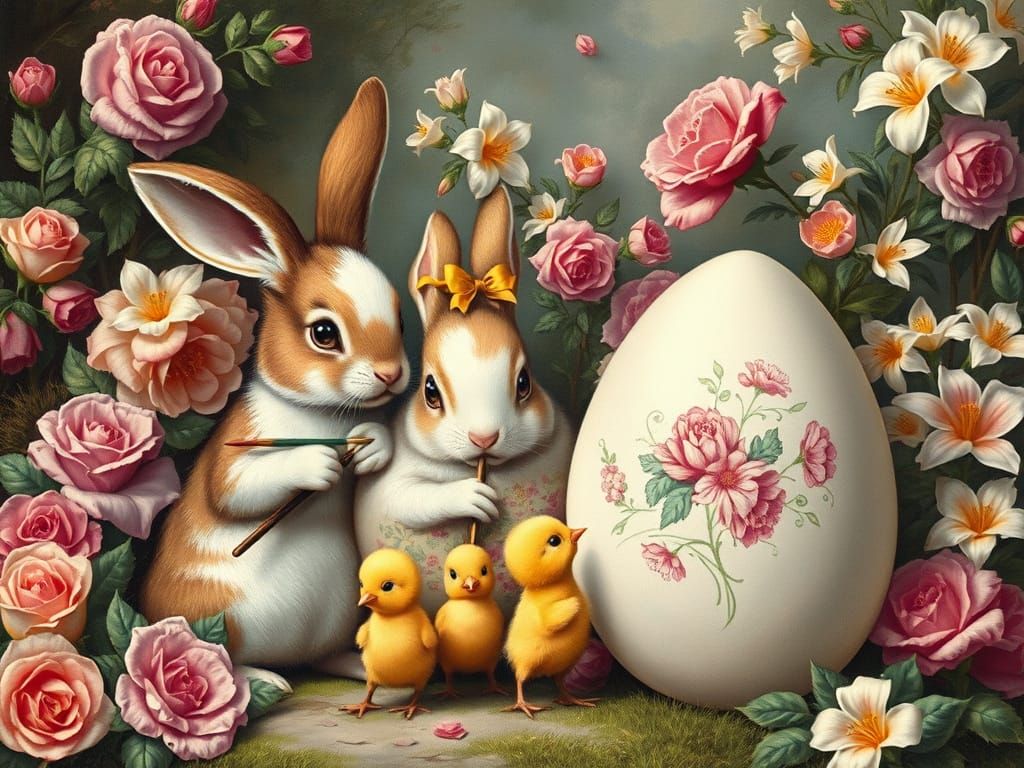 A whimsical scene of two bunnies and two chicks painting Easter eggs. The vintage artwork features intricate floral details, intense colors, and lush textures in a fairy-tale landscape, reminiscent of dramatic etchings.