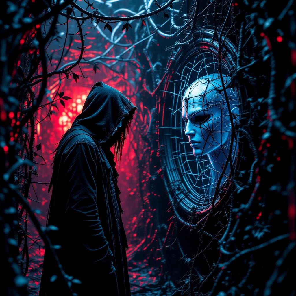 This image shows a figure in tattered clothing staring into a fractured mind surrounded by wire art. Crimson and cobalt streaks accentuate the dark, moody scene as biomechanical art.
