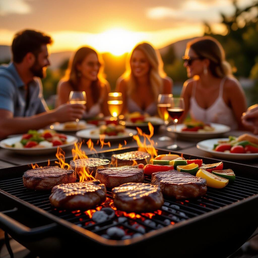 This image captures an outdoor BBQ at sunset, featuring a hot grill with glowing coals, juicy steaks, and vegetables cooking. Warm, cinematic lighting enhances the delicious food photography aesthetic.