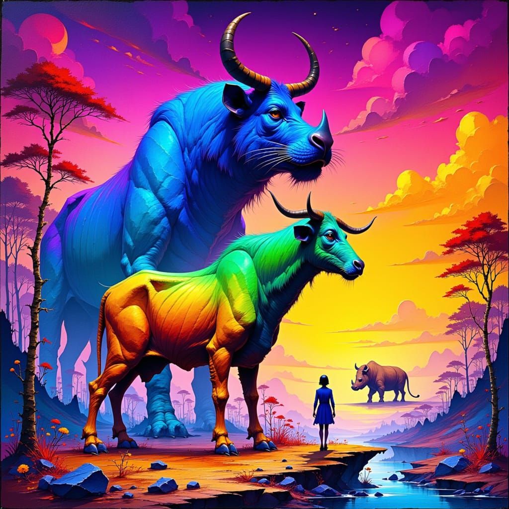 This image shows an iridescent yak in a surreal dreamscape, with a massive illusory tiger in the background. The artwork has a vibrant color palette and intricate details, reminiscent of digital art.