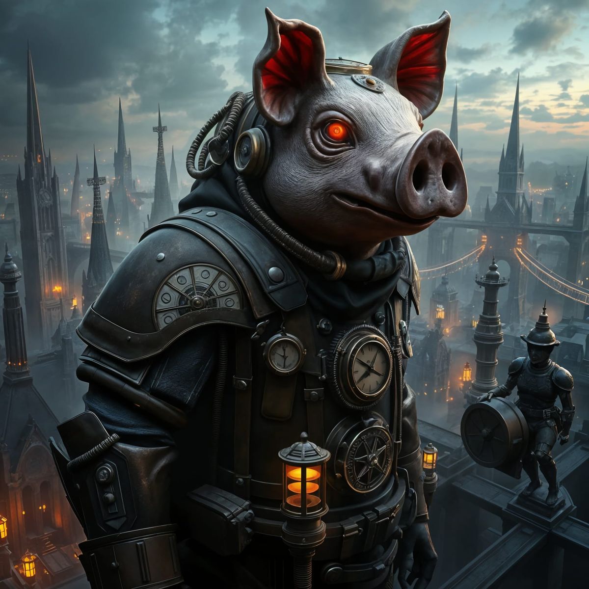 This image shows a giant pig automaton guarding a clockwork city. The steampunk style is evident in the intricate gears, brass plating, and steam-powered vehicles, rendered with hyper-detailed photorealism.