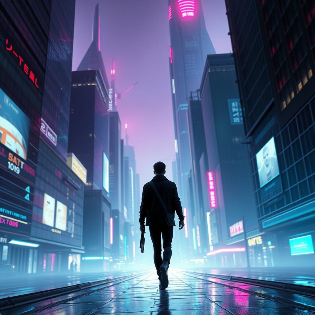 This image shows a person standing in a futuristic city, surrounded by towering skyscrapers and vibrant neon lights, with a blend of industrial and cyberpunk styles. The scene is bathed in deep blues and purples, with accents of bright neon hues, creating a captivating and immersive atmosphere.