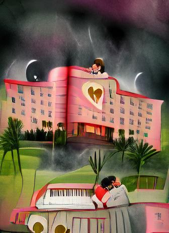 This image shows a storybook illustration of the Heartbreak Hotel. It captures a whimsical and narrative style, reminiscent of classic children's literature.